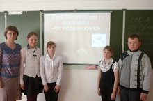 В рамках месячника родных языков в 5 классе был проведен урок -виктирина "Час русского языка" На фото команда победителей "Глагол" и учитель русского языка и литературы Лукашина Н.А.