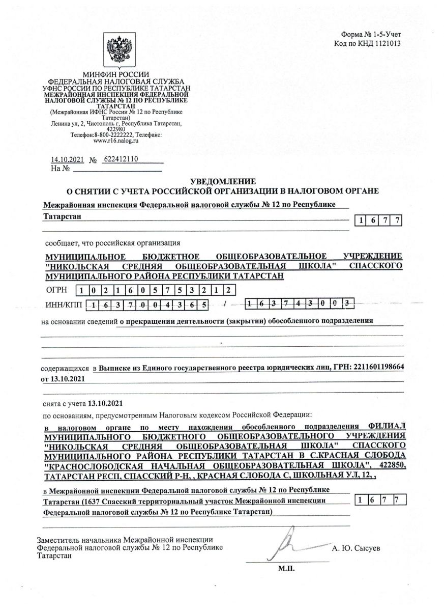 Уведомление о снятии с учета в налоговой инспекции филиала МБОУ "Никольская СОШ" в с.Красная Слобода