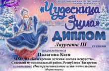 В феврале месяце ученица фортепианного класса Палагина Екатерина (класс преподавателя Илюхиной Ирины Петровны) приняла участие в I Всероссийском конкурсе - фестивале творчества и искусства "Чудесница зима" и получила диплом Лауреата III степени.