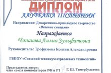 Диплом лауреата III степени, направление : «Декоративно-прикладное творчество «Вязание спицами», награждена Чопанова Лилия, участник IV Республиканского фестиваля творчества обучающихся с ограниченными возможностями здоровья “Поверь в себя», посвященный году народного искусства и нематериального культурного наследия народов России, проходивший в ГАПОУ «Колледж малого бизнеса и предпринимательства» г.Казань,2022 году. Подготовила лауреата Трофимова Ксения Александровна, мастер производственного обучения.