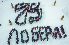 Под музыкальное сопровождение все присутствующие выстроились в форме официального логотипа 75-летия Победы. Цифра 75 в логотипе праздника выполнена в стиле графических стрелок, которые использовались на картах Генштаба СССР для обозначения наступательных действий советских войск.