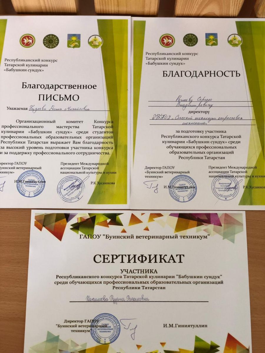 Опубликовано: 08.04.2021Диплом 3 степени завоевала студентка Спасского техникума отраслевых технологий Хакимова Рузана в республиканском конкурсе Татарской кулинарии «Бабушкин сундук». Конкурс проходил 8 апреля 2021 года на базе ГАПОУ «Буинский ветеринарный техникум». Участники конкурса в качестве домашнего задания должны были презентовать старинное забытое блюдо татарской кулинарии. Во второй части в лаборатории нужно было приготовить лапшу и кулламу. Третья часть предусматривала приготовление таких блюд, как кош теле, урама и гульбанак. Подготовила студентку мастер производственного обучения Бизяева Регина Михайловна.