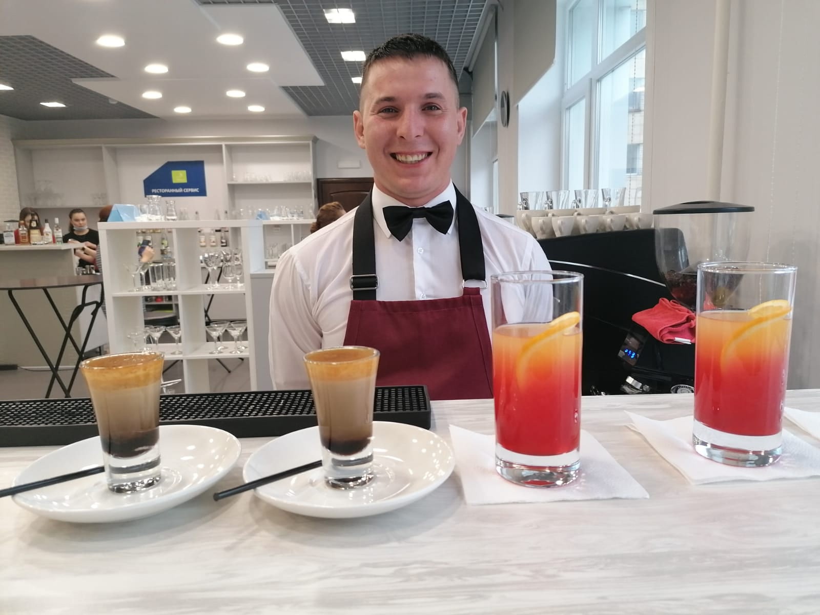 - Бар/ бариста, где Тимур готовил 4 вида кофе и коктейли 3-мя способами: шейк, стир и билд, а также приготовил фантазийный коктейль;
