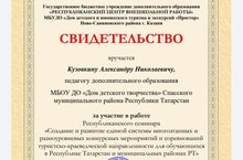 Педагоги МБОУ ДО «Дом детского творчества» Кузовкин А.Н. и Тареев Н.А. приняли участие в семинаре «Создание и развитие единой системы многоэтапных и разноуровневых конкурсных мероприятий и соревнований туристско-краеведческой направленности для обучающихся в РТ и муниципальных районах РТ». Семинар проходил на базе МБУДО «Дом детского и юношеского туризма и экскурсий «Простор» г. Казань.