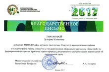 · Благодарственным письмом Министерства лесного хозяйства Республики Татарстан награждена директор МБОУ ДО «Дом детского творчества» Тихонова Зульфия Климовна за плодотворную работу совместно с государственным природным заказником «Спасский» по формированию интереса к проблеме охраны природы, расширению и систематизации знаний детей об окружающей среде.