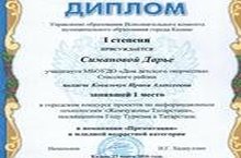 Симанова Дарья, воспитанница объединения «Пользователь ПК» (руководитель – Ковальчук И.А.), награждена Дипломом I степени Управления образования Исполнительного комитета муниципального образования города Казани за 1 место в городском конкурсе проектов по информационным технологиям «Жемчужины Татарстана», посвященном Году Туризма в Татарстане, в номинации «Презентация» в младшей возрастной категории, кроме диплома были вручены ценные подарки.