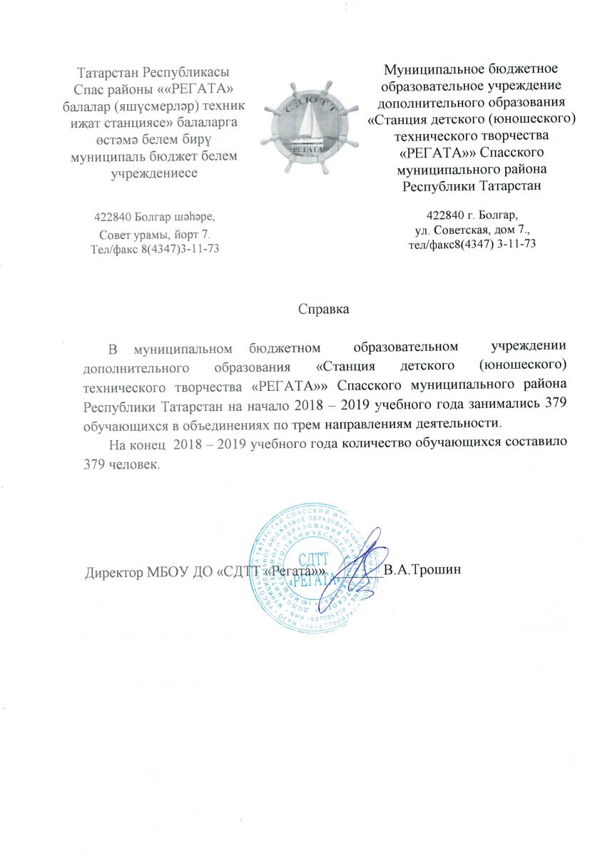 Муниципальное бюджетное образовательное учреждение дополнительного образования «Станция детского (юношеского) технического творчества «РЕГАТА»» Спасского муниципального района Республики Татарстан /Татарстан Республикасы Спас муниципаль районының өстәмә белем бирүче «РЕГАТА» балалар (яшүсмерләр) техник иҗат станциясе» муниципаль бюджет учреждениесе.
