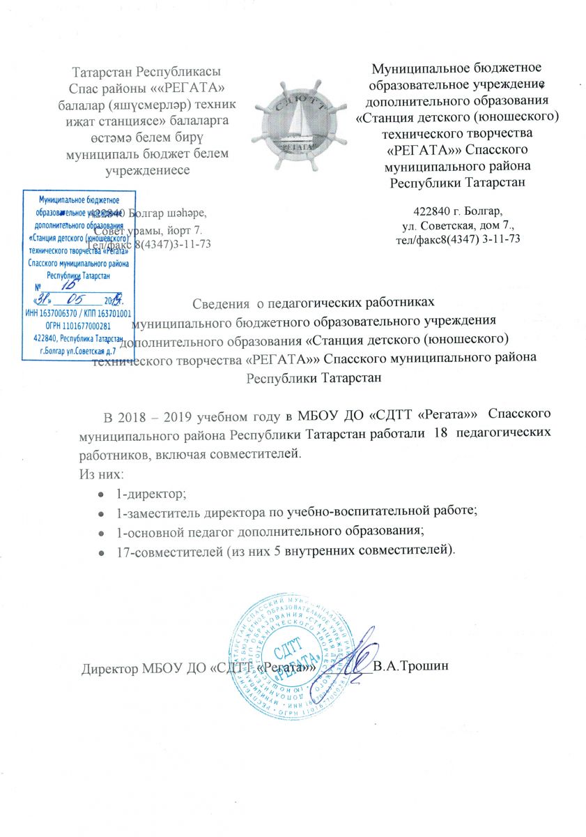 Муниципальное бюджетное образовательное учреждение дополнительного образования «Станция детского (юношеского) технического творчества «РЕГАТА»» Спасского муниципального района Республики Татарстан /Татарстан Республикасы Спас муниципаль районының өстәмә белем бирүче «РЕГАТА» балалар (яшүсмерләр) техник иҗат станциясе» муниципаль бюджет учреждениесе.