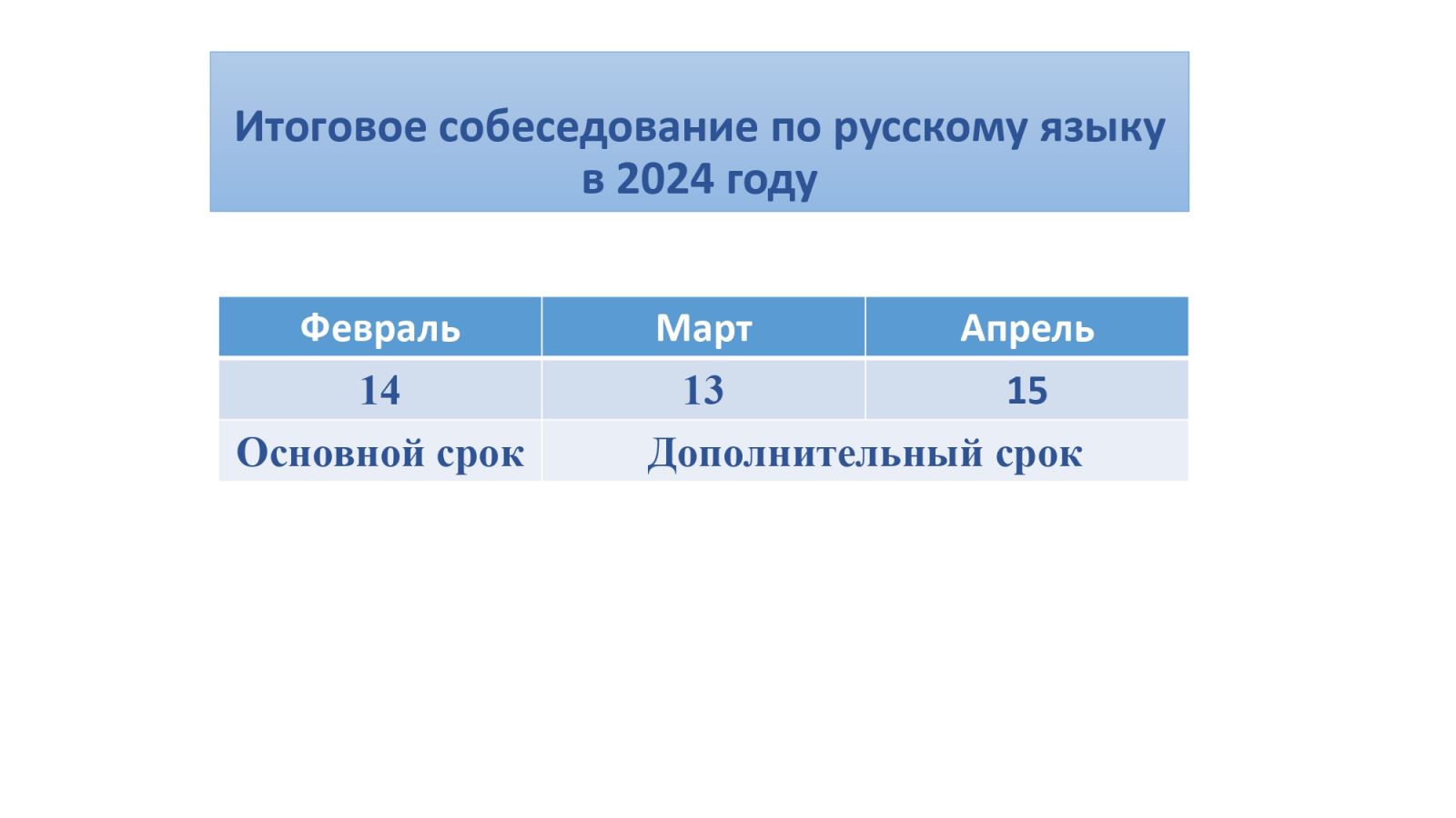 Расписание проведения итогового собеседования по русскому языку в 2023/24 учебном годуОсновной срок - 14 февраля 2024 годаДополнительные сроки:- 13 марта 2024 года и 15 апреля 2024 года Итоговое собеседование по русскому языку