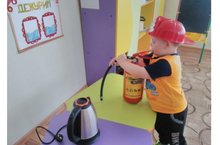 Занятие на тему «Техника безопасности в разных профессиях и дома» с целью закрепления знаний детей о профессиях пилота, водителя, полицейского, пожарного, машиниста поезда; правил поведения в транспорте; знаний об опасных предметах, умения объяснять их опасность. Занятие прошло в форме квест – игры, что очень заинтересовало детей. Они путешествовали в воображаемом на самолете, в автобусе. Выполняли разные задания, отгадывали загадки и находили предметы-отгадки на столе, были в роли водителя, пилота, пожарного. Закрепили знания об опасных предметах, объяснили, в чем их опасность, повторили правила поведения дома и на дорогах. Со старшими детьми изучили плакат «Детям о технике безопасности»
