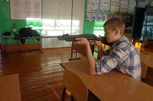 Стрельба из пневматической винтовки из положения сидя или стоя с опорой локтей о стол или стойку.