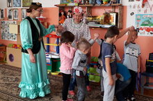 В детском саду прошел "День национального костюма". Детям показали национальные костюмы разных народов. Заведующий и воспитатель были одеты в национальный костюм татарского народа и вместе с детьми поиграли в игры татарского народа.