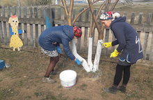 Бүген балалар бакчасы хезмәткәрләре тирә-якны чистартып, агачларны аклап чыктылар.Сегодня работники детского сада очистили территорию детского сада, побелили деревья. -