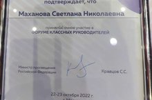 22 и 23 октября в г.Москва прошел II Всероссийский форум классных руководителей. В этом масштабном мероприятии принимает очное участие классный руководитель 11 класса нашей школы Маханова Светлана Николаевна. Открывают форум Первый заместитель Руководителя Администрации Президента Российской Федерации Кириенко С.В., министр просвещения Российской Федерации Кравцов С.С. и Генеральный директор Российского общества "Знание" Древаль М.А. В программе форума предусмотрены различные мероприятия воспитательной направленности: круглые столы, мастер-классы, лекции, встречи и дискуссии.