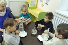 Воспитанники дошкольной группы с помощью простых опытов изучили свойства воды. В результате экспериментальной деятельности они доказали, что вода не имеет форму, принимает форму сосуда, в котором находится.