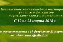 с 12 по 23 марта 2018 года проводится независимое компьютерное тестирование по русскому языку и математике в 4 классе. Специфика тестовых заданий размещена на айте Тестирования www.effekttest.ru