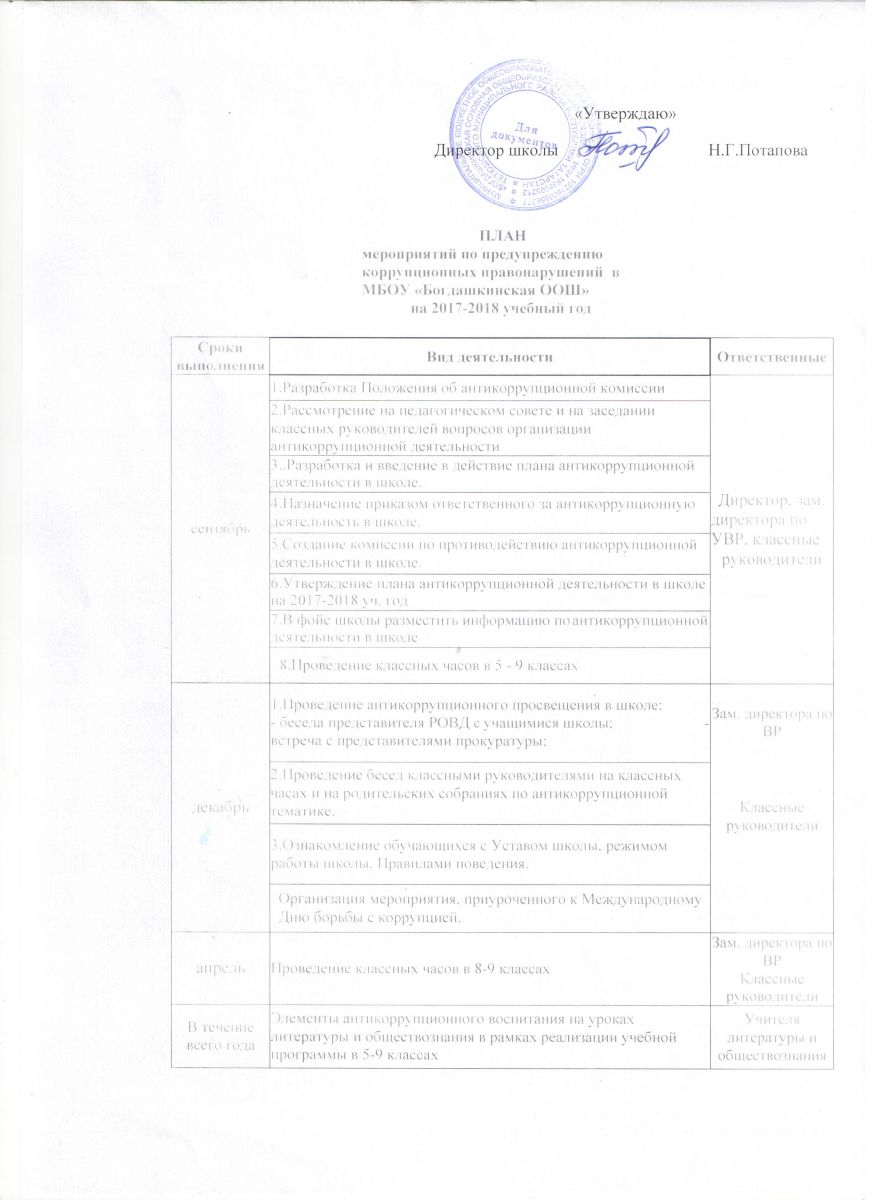 План мероприятий по предупреждению коррупционных правонарушений на 2017-18 уч.год