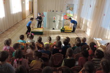 "Правила дорожные Детям знать положено! И не только твердо знать, Но еще и соблюдать! Будешь ты умен и смел, А еще здоров и цел!" В музыкальном зале детского сада «Березка», для всех детей был показан кукольный театр «Колобок в городе». На примере героев театра кукол дети уточнили и закрепили знания по правилам дорожного движения.