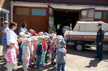 Экскурсия дошкольников в пожарную часть 29.06.2017 Для детей пожарный, спасатель – люди героические, так было и в былые годы, и сегодня. Они спасают из огня людей, встают на пути у разрушения. В детском саду проводится много бесед о правилах безопасности, что нельзя играть со спичками, с огнем, одним уходить из дома, купаться. Но совсем по-другому детьми усваиваются правила пожарной безопасности, безопасности на воде, когда об этом рассказывает человек, который непосредственно относится к этой работе. С этой целью, 29 июня дети в возрасте 5-7 лет посетили пожарную часть. Детей тепло встретил целый караул пожарных. Веселым гулом ребячьих голосов наполнилось пожарное депо. Старший государственный инспектор по маломерным судам Ананьев А.В. показал детям катер для спасения на воде, рассказал о правилах купания, для чего необходим спасательный жилет и круг. Показал, как правильно пользоваться спасательным кругом. Ребята пришли в восторг оттого, что примерили на себе спасательные жилеты. Далее детей провели в гараж, где показали, чем вооружен пожарный для борьбы с огненной стихией, рассказали, для чего служит тот или иной предмет из многочисленного пожарного снаряжения. И, конечно же, ребят, заинтересовала сама пожарная машина, которая выехала во двор к детям. Дошкольники мгновенно обступили её. Командир 4-го караула Замалетдинов Ф.Ф. рассказал про машину, показал детям, как и чем она оборудована. И предел мечтаний каждого ребенка, это посидеть в пожарной машине, что и предоставили работники ПЧ. В завершение экскурсии всем детям были розданы памятки по мерам пожарной безопасности.