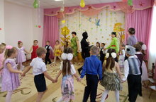 С этого стихотворения сегодня в средней группе начался осенний праздник «Осенние чудеса». Дети очень любят праздники, особенно если приходят их любимые родители. Это для них они старались: пели, танцевали, рассказывали стихи об осени. Но им особенно понравилось появление на празднике сказочных персонажей: Пугало Огородного, Бабы Яги и домовенка Кузи. Вот тут они веселились от души! Но и родители приняли участие в соревновании «Собери картошку», никому не хотелось проигрывать. А в конце праздника Осень угостила ребят яблочным пирогом.