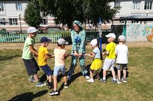 В гости к детям приходил жизнерадостный клоун Тимошка. Ребята рассказывали стихи, отгадывали загадки, соревновались друг с другом в эсафетах: " Забей в цель", " Переправа", " Быстрый бронепоезд", участвовали в конкурсах: " Перетяни канат", " Чья лошадка быстрее", " Слушай мою команду", " Полевая кухня".