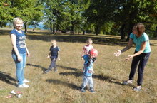На лесной полянке ребята со своими родителями играли в подвижные игры, прыгали через скакалку, крутили обруч, наблюдали за насекомыми, собирали разноцветные листья, желуди. Ну, какой же поход без привала. Дети доставали из своих рюкзаков приготовленную родителями еду и угощали друг друга. Вот такой интересный выдался у нас поход.