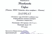 Воспитанница 10 класса Молоканова Дарья стала лауреатом «Осеннего тура 2014-2015 учебного года всероссийского конкурса «Познание и творчество» в номинации «ЕГЭ –тренинг (10-11 кл.)» (руководитель учитель математики Ковшова Т.Н.)
