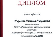 Поздравляем Пирогову Наталью Николаевну учителя химии и физики Тетюшской кадетской школы-интерната, занявшую 2 место в республиканском конкурсе «Все грани химии» (номинация «Внеклассное мероприятие по химии»).