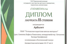 В данном конкурсе из Тетюшской кадетской школы-интерната участвовала театральная группа кадет «АрБалет». В состав группы входит: Евсеева К., Хисматуллин Т., Храмова А., Ляченкова Е., Югушев В., Шайхутдинов Р., (руководители: Н.Р.Сиякина и Латыпова Х.Х).