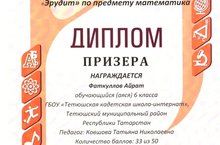 По результатам участия в республиканской олимпиаде для школьников 1-6 классов «Эрудит» по математике Дипломом призера награжден воспитанник 6 класса Тетюшской кадетской школы-интерната Фаткуллов Айрат (руководитель Ковшова Т.Н.). Учитель награжден Дипломом за подготовку призера к олимпиаде.