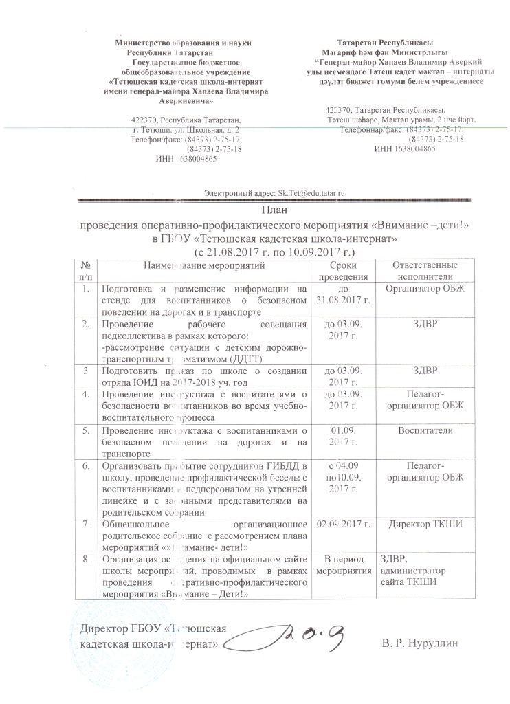 План мероприятий по профилактике экстремизма, обеспечению антитеррористической безопасности в ГБОУ «Тетюшская кадетская школа-интернат» на 2017-2018 учебный год