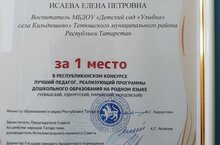 Воспитатель нашего детского сада Исаева Елена Петровна стала победителем республиканского конкурса «Лучший воспитатель, реализующий программы дошкольного образования на родном языке» В номинации «Мордовский язык».