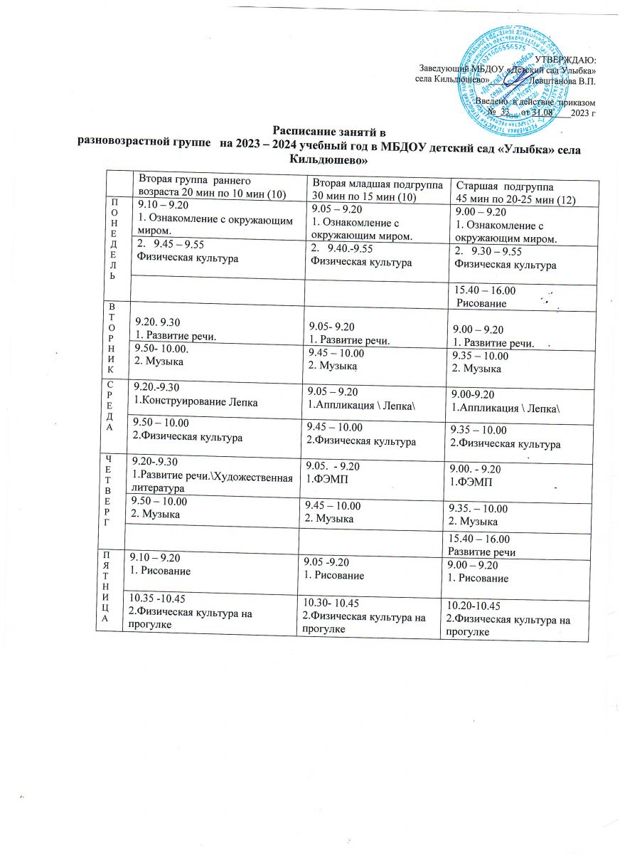 Расписание занятий в МБДОУ "Детский сад "Улыбка" села Кильдюшево" на 2023 -2024 учебный год