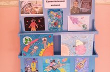 В фойе школы организована выставка рисунков, посвященная Дню космонавтики.