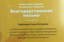 В рамках форума юных граждан за добросовестный труд, поддержку инициатив активистов детских общественных объединений Тетюшского района и вклад в развитие детского движения Республики Татарстан. Благодарственным письмом Министра по делам молодежи награждена: Горбунова Елена Петровна- педагог организатор нашей школы.