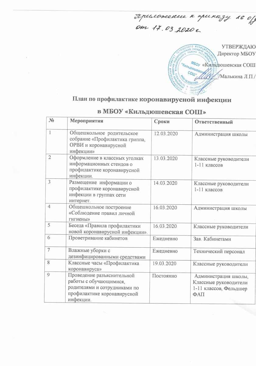 План работы по профилактике коронавирусной инфекции МБОУ "Кильдюшевская СОШ" (смотреть)