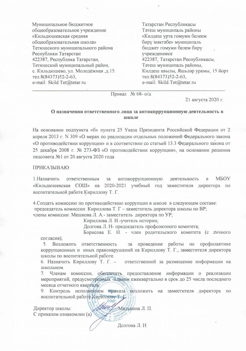 Приказ о назначении ответственного лица за антикоррупционную деятельность на 2020 - 2021 учебный год