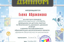 Елена Абраконова стала победителем конкурса "Безопасный блог сентября 2022", который проходит на портале по безопасности дорожного движения "Сакла", в рамках Республиканского образовательно-воспитательного проекта "Дневник безопасности школьника".