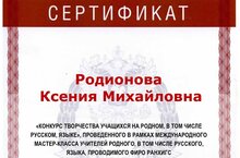 Родионова Ксения, учащаяся 10 класса, приняла участие в международном конкурсе творчества учащихся на родном, в том числе русском, языке, проведенного в рамках мастер-класса учителей родного, в том числе русского, языка. Организатором конкурса является Российская Академия народного хозяйства и Государственной службы при президенте Российской Федерации. Руководитель работы: Самсонова Л.Н., учитель русского языка и литературы