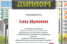 Дипломом за победу в конкурсе "Безопасный блог декабря", проводимом на детском портале по безопасности дорожного движения "Сакла" в рамках Республиканского образовательно-воспитательного проекта "Дневник безопасности школьника", награждается Абраконова Елена, ученица 6 класса