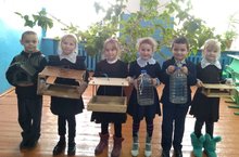 Первоклассники вместе с родителями изготовили в каникулы кормушки для птиц. На уроке окружающего мира говорили о зимующих птицах, что в зимнее время птицы нуждаются в заботе и их нужно подкармливать.