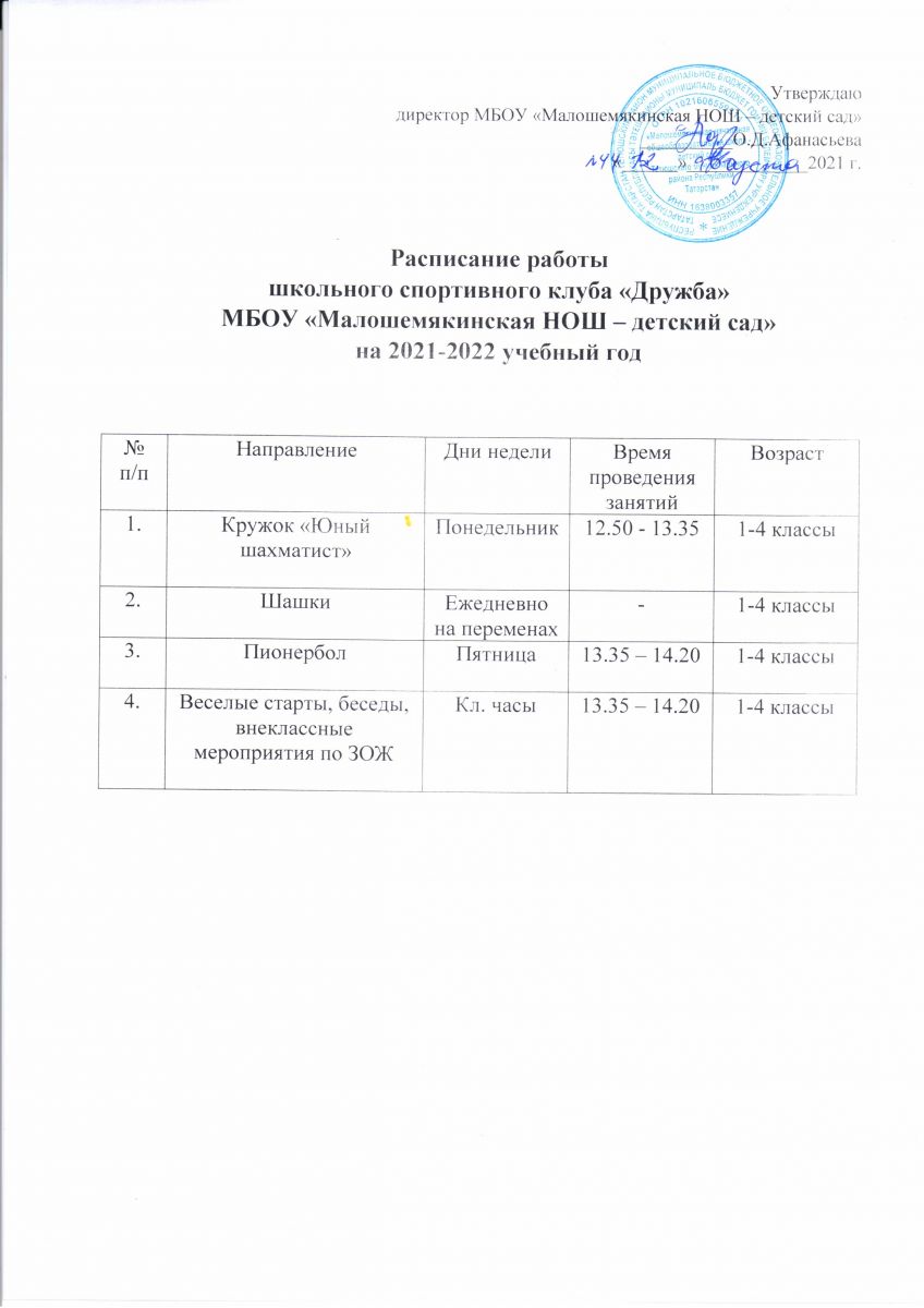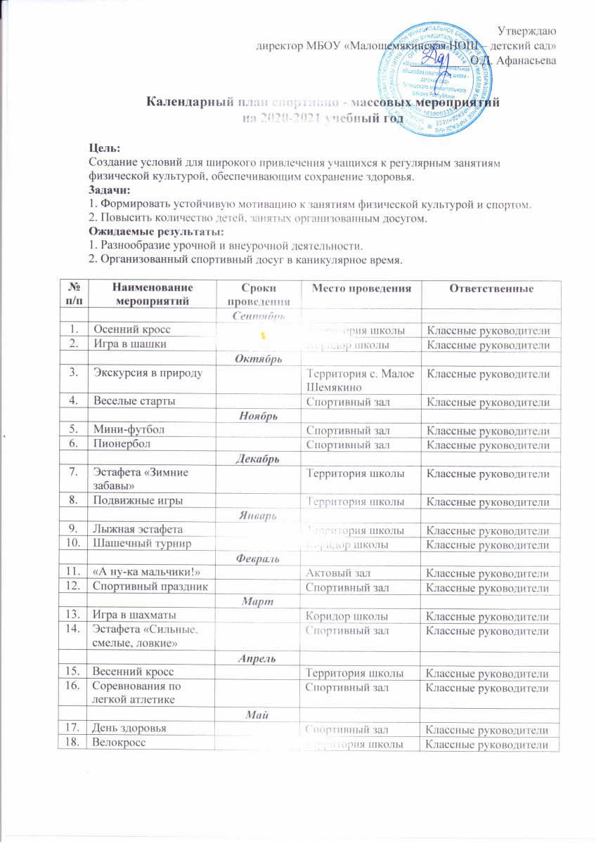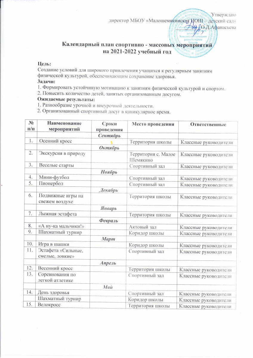 Календарный план спортивно-массовых мероприяний на 2021-2022 учебный год