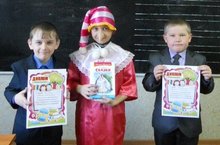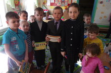 Прощание с "Азбукой" в 1 классе. В гости к ребятам приходил Буратино. Он проверил детей на умение хорошо читать, составлять слова из слогов. На память Никита и Виталий получили дипломы и книги.