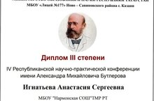 Игнатьева А. С., учитель английского языка , приняла участие в IV Республиканской научно-практической конференции имени А.М. Бутлерова. По итогам работы экспертной комиссии Анастасия Сергеевна награждена дипломом III степени.
