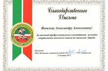 Благодарственным письмом награжден тренер-преподаватель по Спортивной борьбе (Вольная борьба) Яковлев Александр Алексеевич