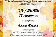 По итогам III Республиканского конкурса детского творчества «Мгновения Осени» в номинации «ДПИ» в разных возрастных категориях Лауреатами II степени стали обучающиеся класса декоративно-прикладного творчества: Васина Ульяна, Нуриева Диана, Тойкина Александра,Тюлебаева Аделина.