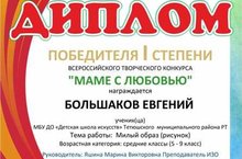 Учащиеся Детской школы искусств художественного отделения под руководством преподавателя Яшиной М.В. приняли участие во Всероссийских творческих конкурсах: «Осенние фантазии» и «Маме с любовью», посвященные Дню Матери в России. Цель конкурсов: реализация творческих способностей детей школьного возраста, интереса к художественным видам творчества и выявление талантливых детей. Конкурсы проводились по соответствующим возрастным группам. В результате, по итогам в номинации "Рисунок" учащиеся Детской школы искусств Старостина Элина (1 класс ДШИ) и Большаков Евгений (3 класс ДШИ), стали победителями и удостоены Дипломов I степени. Учащиеся представили на конкурс творческие работы по теме: «Осенняя пора, очей очарование…» и «Милый образ». Поздравляем!