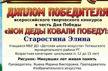 С 10 по 25 апреля 2021 года учащаяся Детской школы искусств художественного отделения Старостина Элина под руководством преподавателя Яшиной М.В. приняла участие во Всероссийских творческих конкурсах исполнительского мастерства: «Мои деды ковали Победу» и «О Родине, о мужестве, о славе». Цель конкурсов: сохранение памяти о важнейших событиях в истории нашей страны; пропаганда патриотических духовных ценностей, национальной гордости, реализация творческих способностей, выявление талантливых детей. Конкурсы проводились по соответствующим возрастным группам. В результате, по итогам конкурсов, в номинации: "Рисунок», «Изобразительное, фото, видео искусство» в номинации «Живопись и графика" Старостина Элина (1 класс ДШИ) награждена Дипломом Победителя и Дипломом за I место. Элина представила на конкурсы творческие работы по темам: «Минувших лет живая память» и «Горячий Кандагар». Поздравляем!