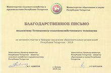 13 октября 2018 г. ГАПОУ «Тетюшский сельскохозяйственный техникум» принял активное участие в Ярмарке продукции образовательных организаций Республики Татарстан — 2018, которая прошла в Агропромышленным парке г.Казань. На реализацию было представлено 11 наименований сельхозпродукции, выращенной на полях учебного хозяйства и в теплице техникума: пшеница, ячмень, лук, морковь, свекла, капуста и т.д.