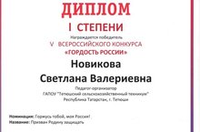 Педагог-организатор ГАПОУ «Тетюшский сельскохозяйственный техникум» С.В. Новикова, участвуя в V Всероссийском конкурсе «Гордость России», стала победителем в номинации «Горжусь тобой, моя Россия!»